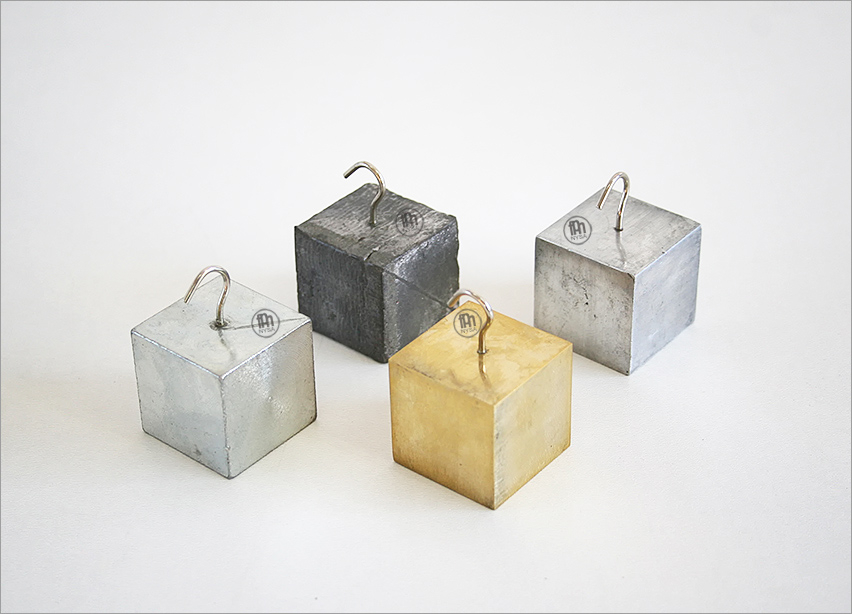 Un set de 4 cuburi cu carlig din aluminiu, alama, fier si plumb destinat experimentelor de determinare a densitatii diverselor materiale. Dimensiunile fiecărui bloc: 3,2 x 3,2 x 3,2 cm.